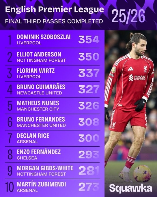 1月10日讯 数据机构squawka统计了本赛季英超在进攻三区的成功传球次数情况,索博斯洛伊压安德森居首。